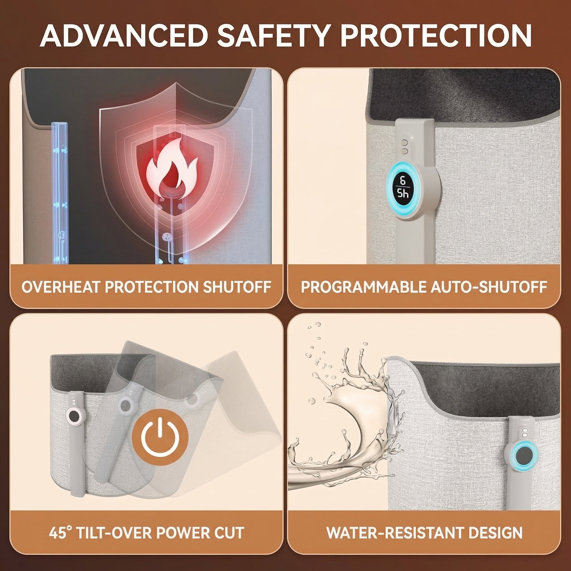 V-0 flame-retardant material, auto overheat protection, and tip-over shutoff built in. Leave it on while you sleep.