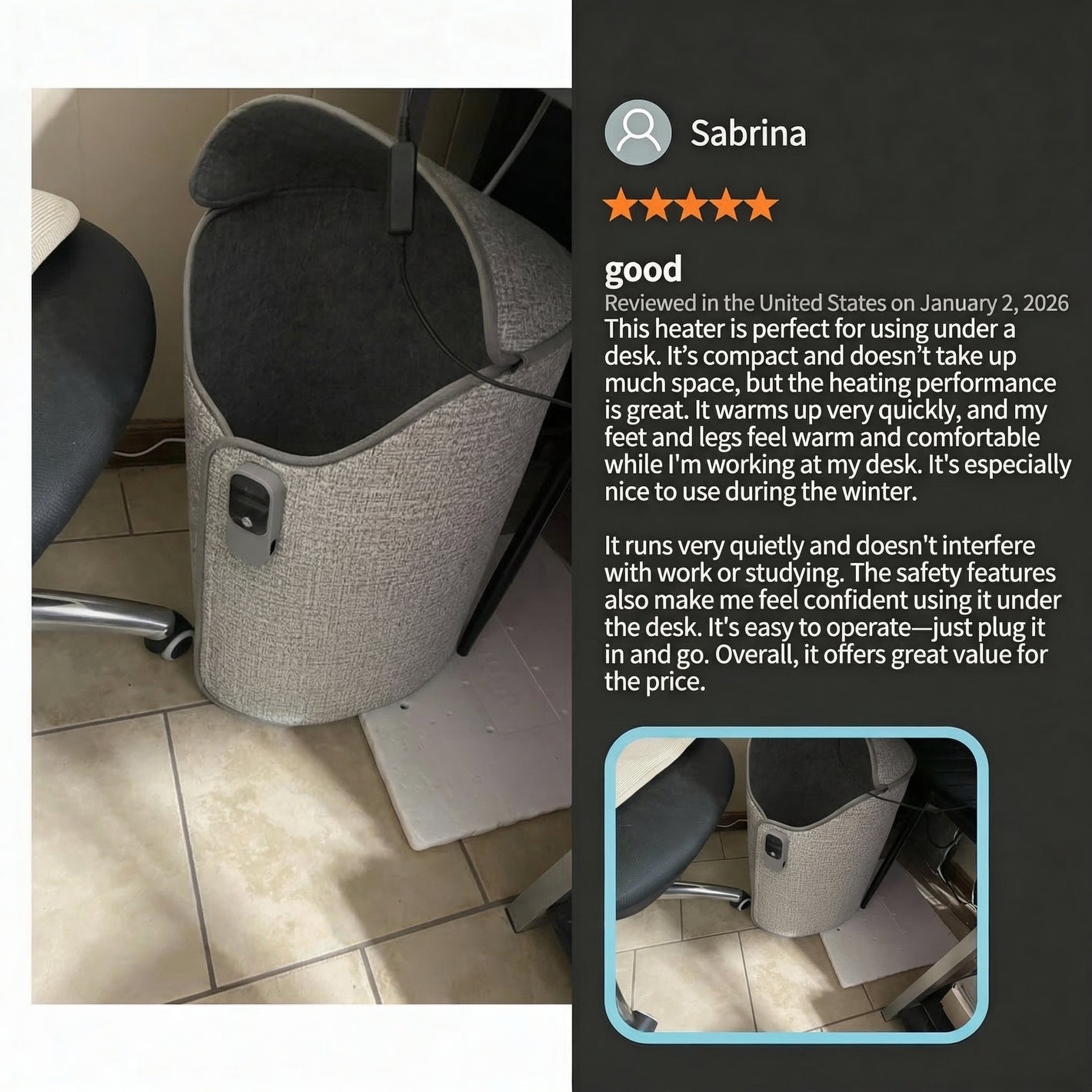 I was spending $40 a month running my old space heater. This costs almost nothing and keeps my feet way warmer. Should have bought it sooner.