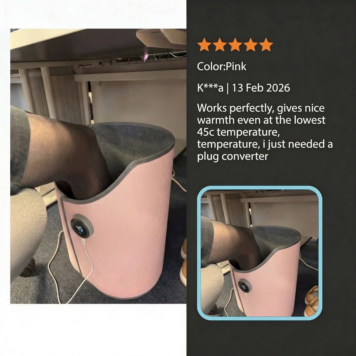Surrounds your legs and feet from every angle for even, consistent heat that regular heaters simply cannot match.